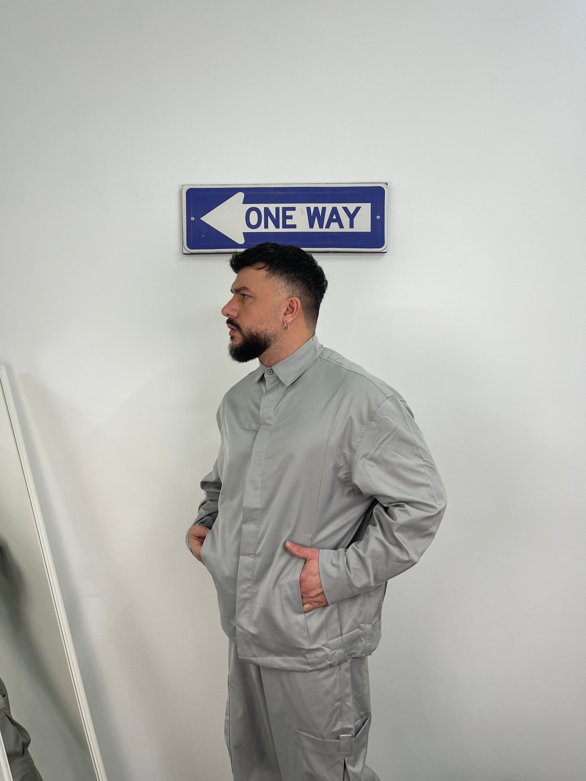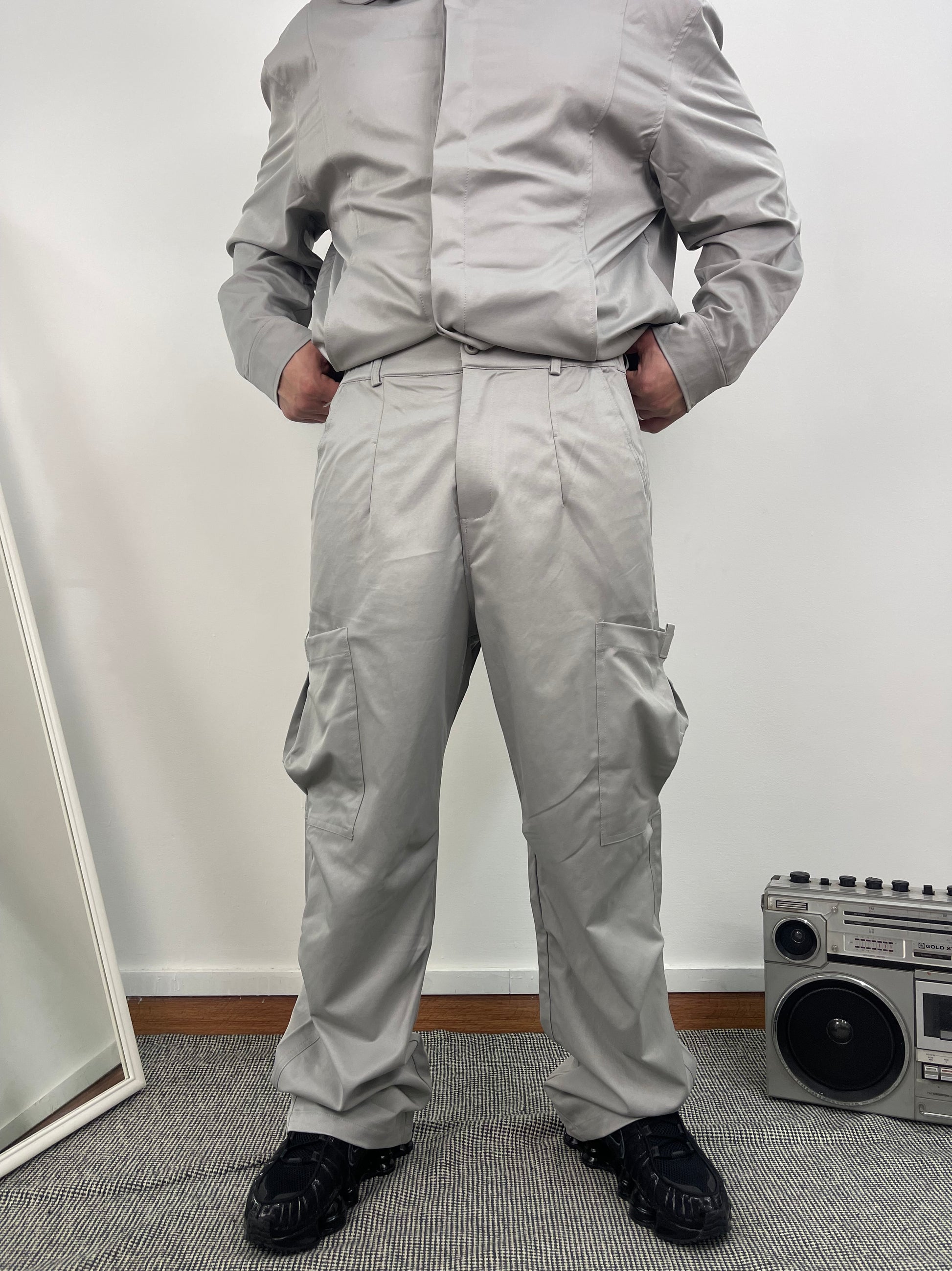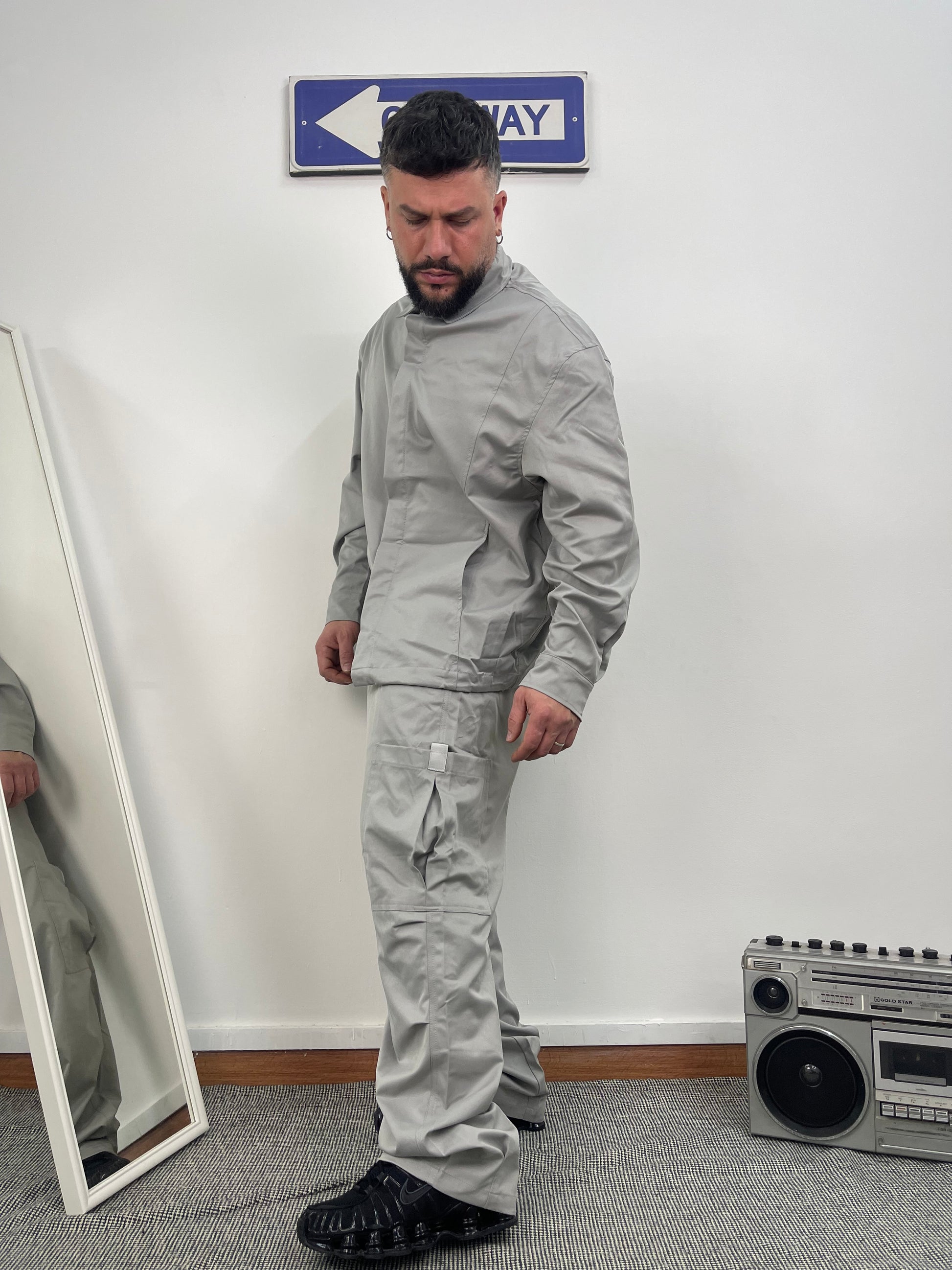 Coordinato grigio in poliestere, giacca con chiusura bottoni a scomparsa, laterale con cord Lock per rendere la vestibilità “cropp fit” pantalone con bottone fascia rigida anteriore, mentre lato posteriore elastico, più passanti per cintura, tasche laterali America, più tasconi su gambe, fondo largo.