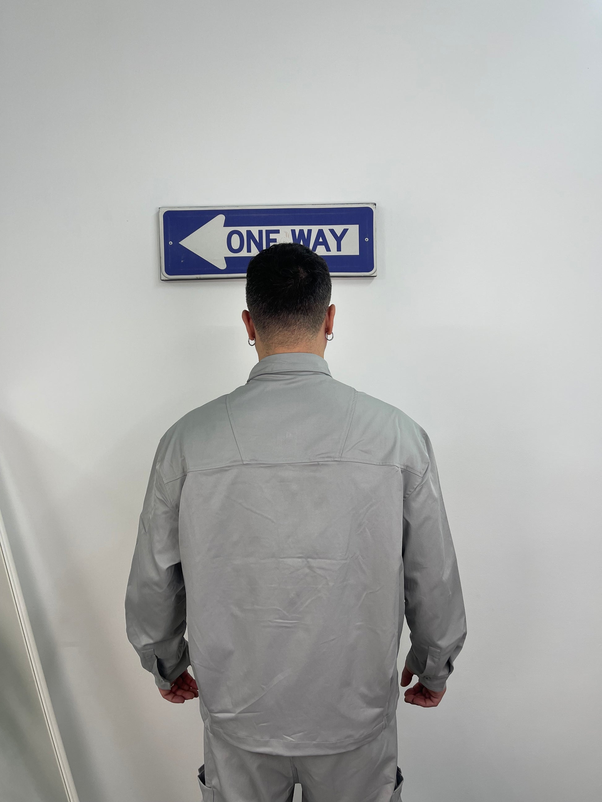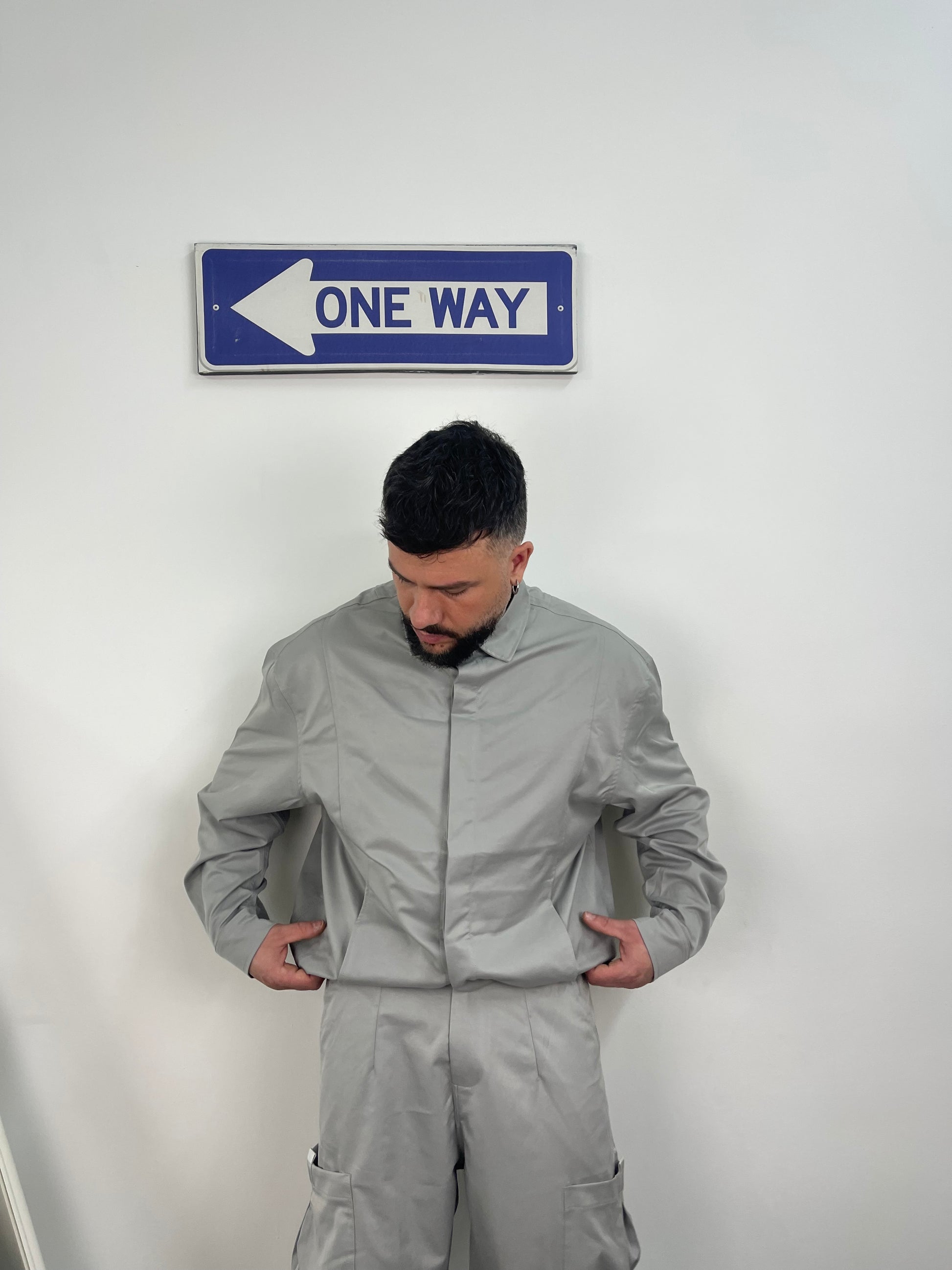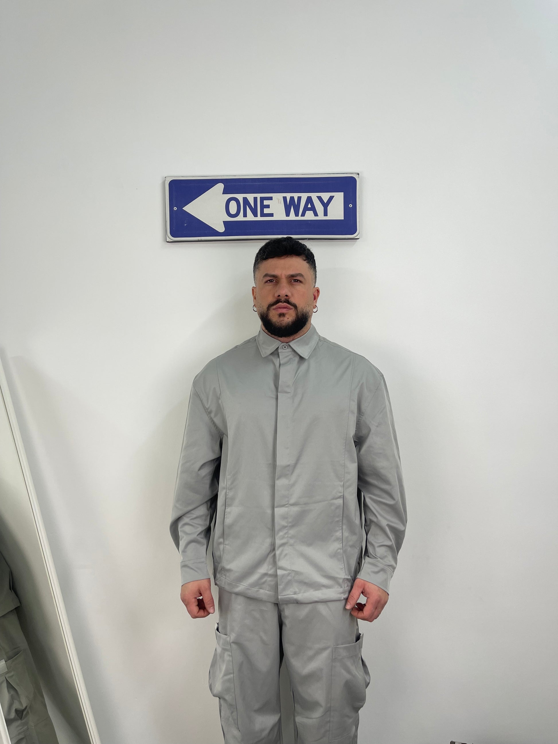 Coordinato grigio in poliestere, giacca con chiusura bottoni a scomparsa, laterale con cord Lock per rendere la vestibilità “cropp fit” pantalone con bottone fascia rigida anteriore, mentre lato posteriore elastico, più passanti per cintura, tasche laterali America, più tasconi su gambe, fondo largo.