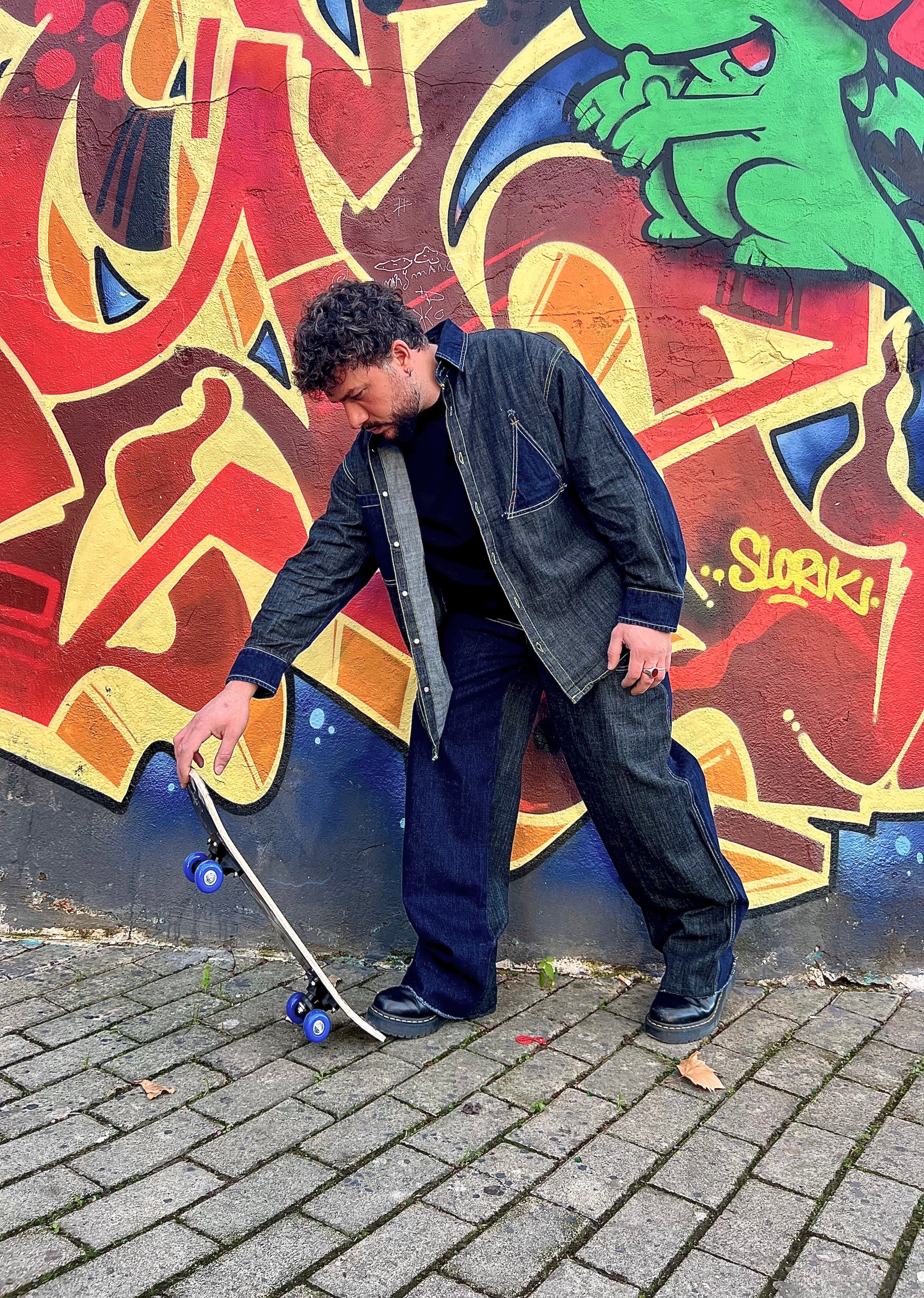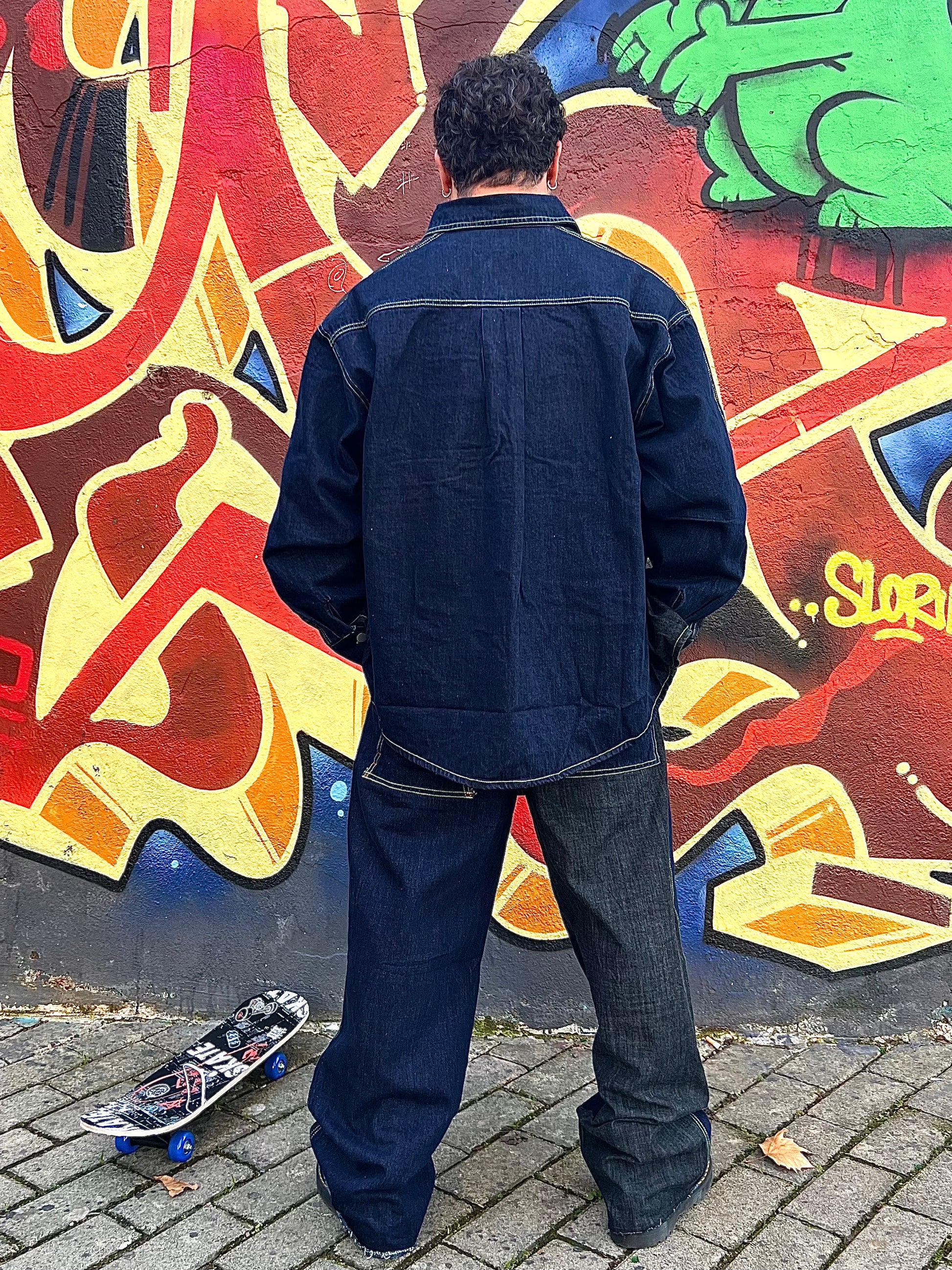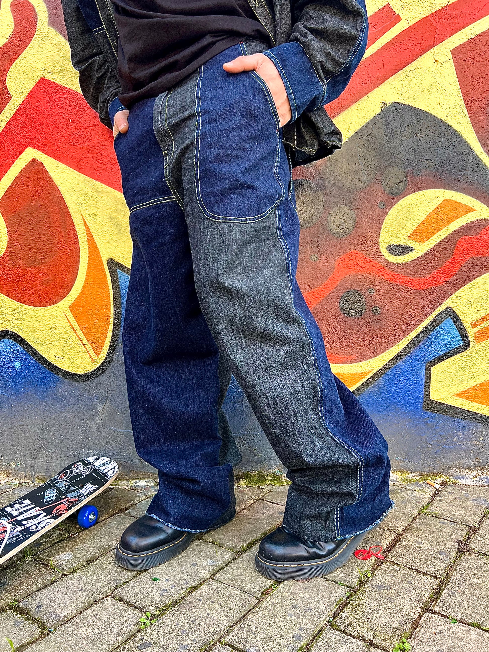 Coordinato in jeans oversize blu e grigio, con cuciture gialle
