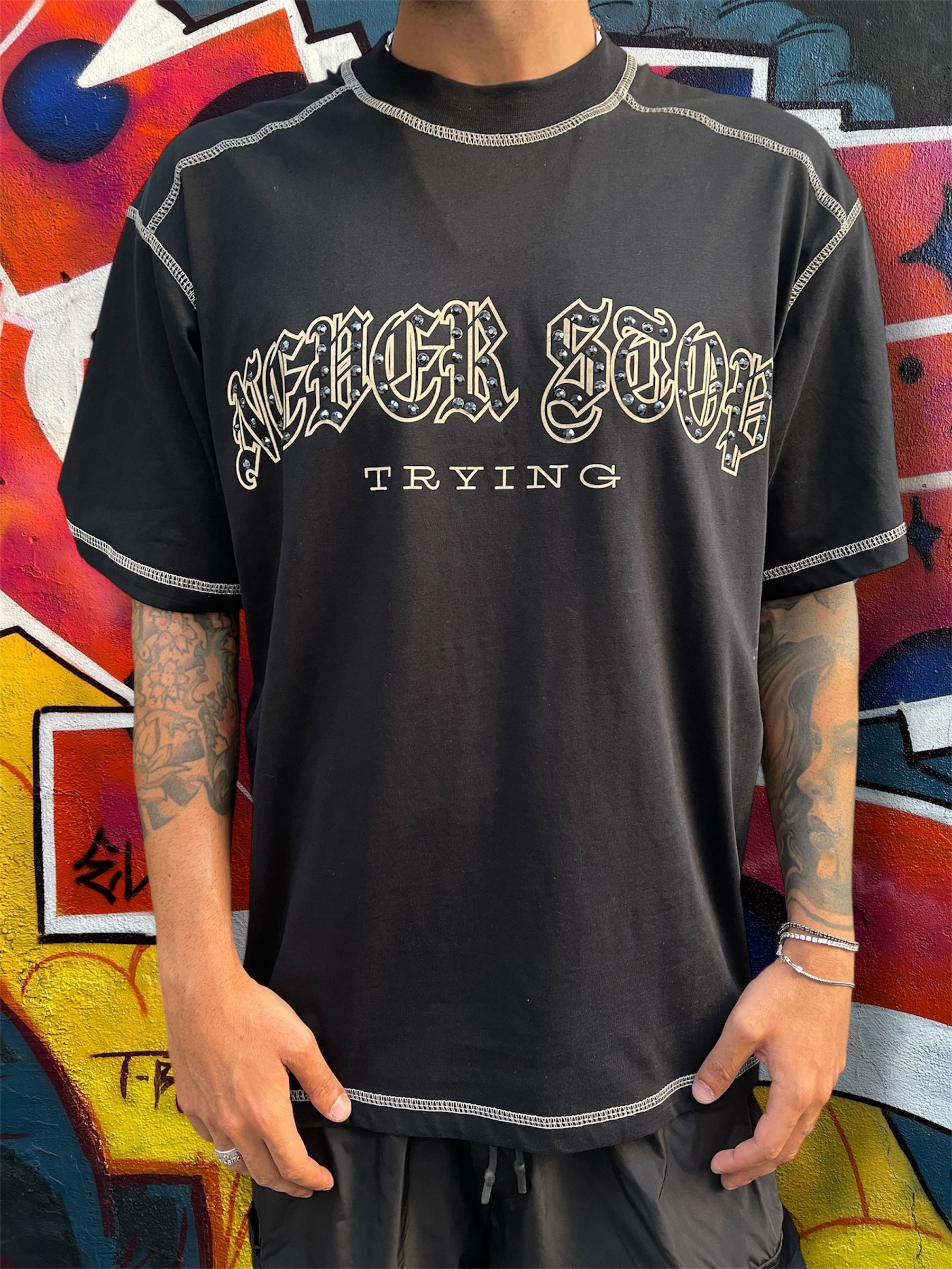 T-shirt Never Stop by Bunker con scritta diamantata elasticizzata( Fit regolare, cotone )