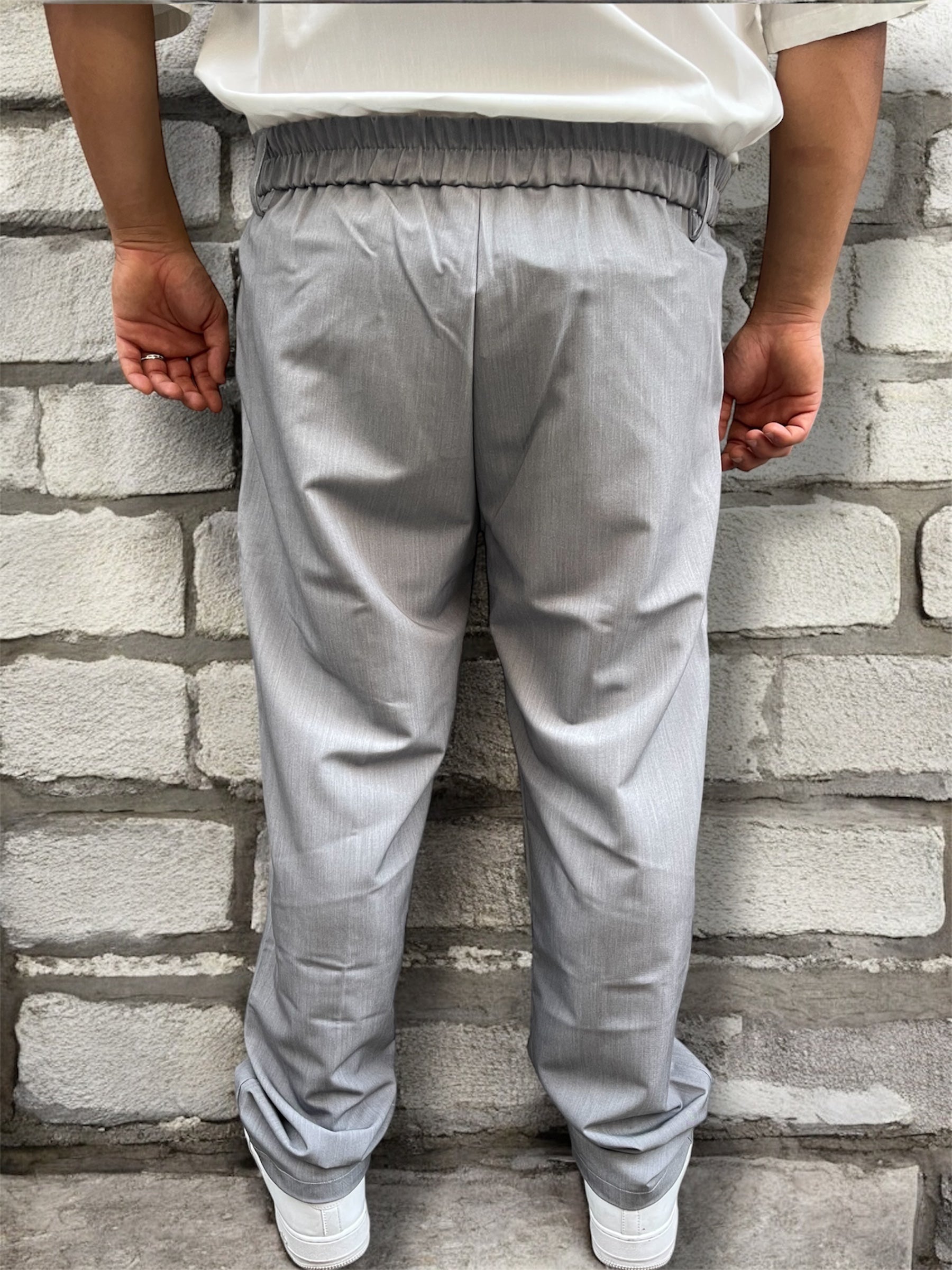 Pantalone classico fit ampio con cucitura a contrasto sul davanti, tasche laterali, mezzo bustino con bottone, e elastico sul retro.